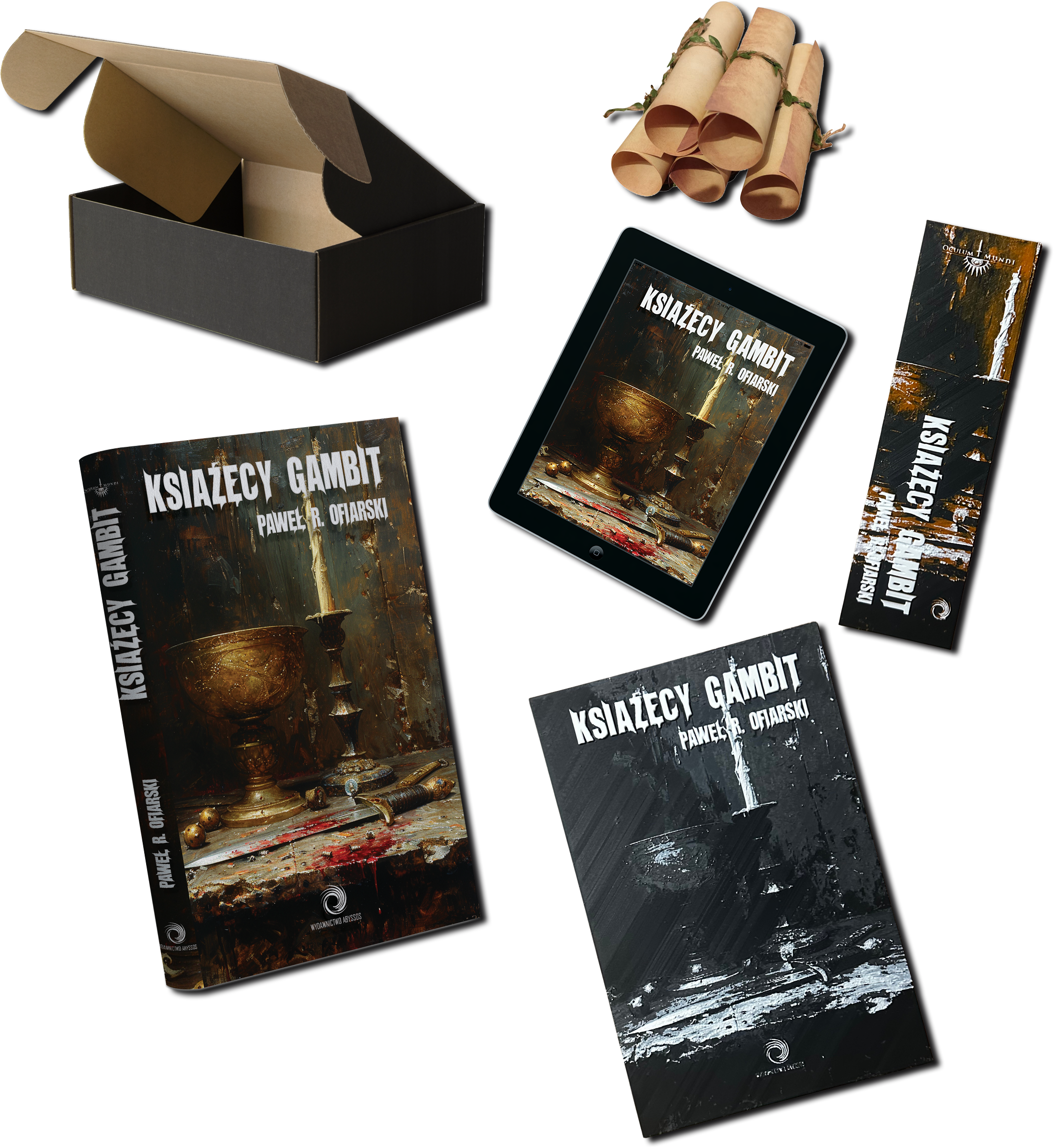 - Okładka 3D w formie obrazu – elegancki element dekoracyjny, umożliwiający wyeksponowanie okładki Książęcego Gambitu w dowolnej przestrzeni dzięki efektowi trójwymiarowości